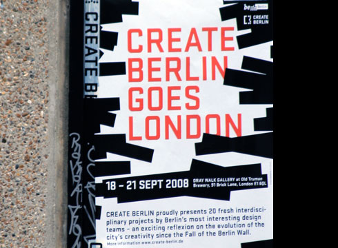 Die Berliner Kreativen hatten während des London Designfestivals 2008 einen besonderen Platz in der britischen Hauptstadt. In der Ausstellung CREATE BERLIN GOES LONDON präsentierte Create Berlin in Kooperation mit Berlin Partner die zwanzig besten interdisziplinären Projekte, Konzepte und Ideen zum Thema “20 Jahre Kreativmetropole Berlin”.